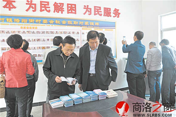 在山陽縣中村鎮洛峪街村,市民政局局長賈意有和山陽縣民政局局長江忠庭在翻閱宣傳手冊。