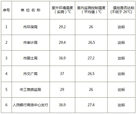 商洛之窗訊 8月24日,市節能監察中心聯合市機關事務局對市環保局等6家市直公共機構夏季室內溫度控制情況進行了專項執法監察,監測結果表明全部合格。