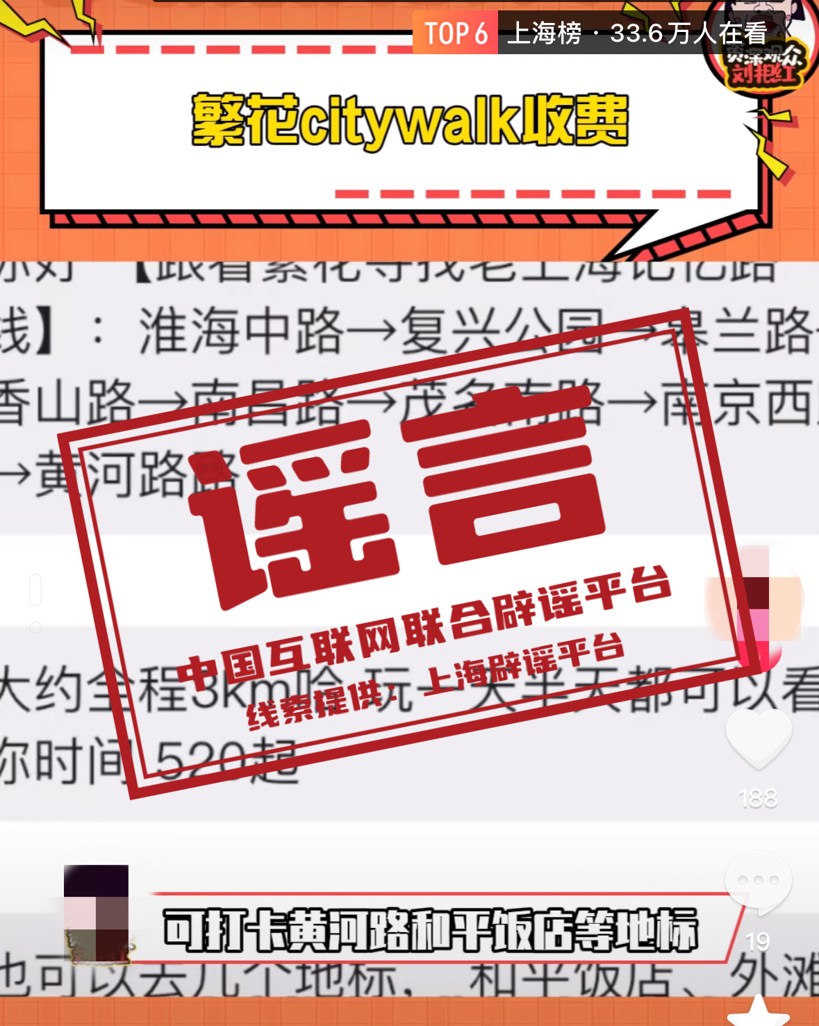為此,上海辟謠平臺以“上海Citywalk”“繁花Citywalk”等為關鍵詞,搜索了多家旅游服務在線平臺、社交平臺,都沒有發(fā)現(xiàn)主播們引用的“3公里Citywalk收費520元”圖片,也沒有看到與“繁花Citywalk”相關的收費服務。(來源:“上海網(wǎng)絡辟謠”微信公眾號)