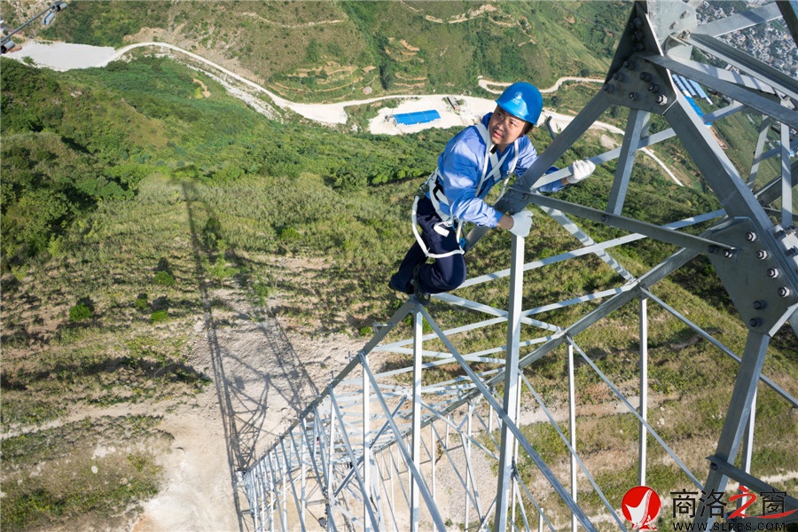 商洛之窗訊  7月30日,在攝氏40°高溫下,陜西商洛供電公司員工在30米高的鐵塔上揮汗作業。他們奔走在峻嶺之巔的鐵塔上、銀線間,用勤勞和勇敢“編織”著輸送光明的電網。