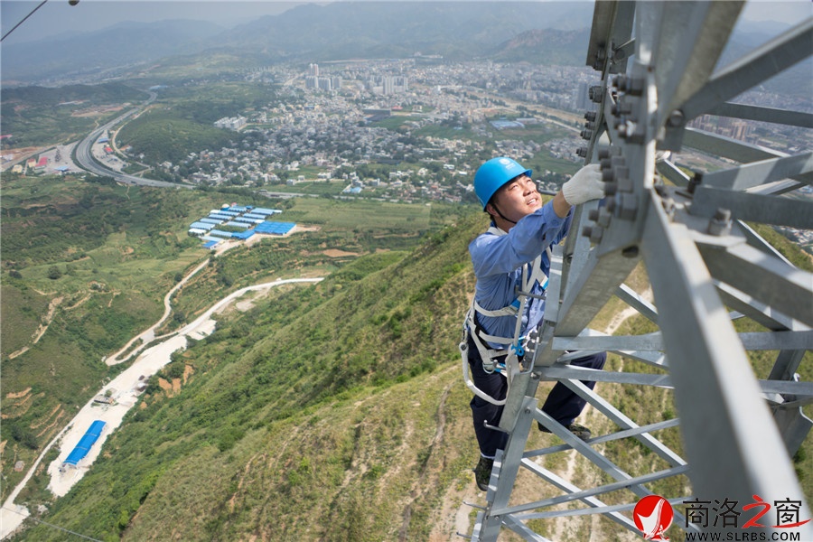 商洛之窗訊  7月30日,在攝氏40°高溫下,陜西商洛供電公司員工在30米高的鐵塔上揮汗作業。他們奔走在峻嶺之巔的鐵塔上、銀線間,用勤勞和勇敢“編織”著輸送光明的電網。