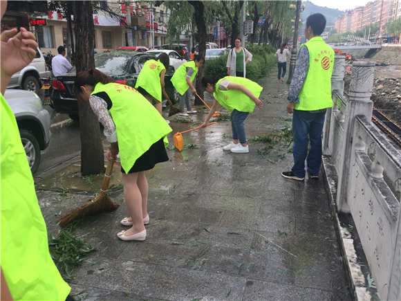 商洛移動組織志愿小分隊志愿者們手提掃帚、鐵锨、抹布等,在濱河路沿線開展清掃路面樹葉、排水管道清理等工作,經過大家的共同努力,濱河路路面全部清掃干凈,道路暢通,交通恢復正常。