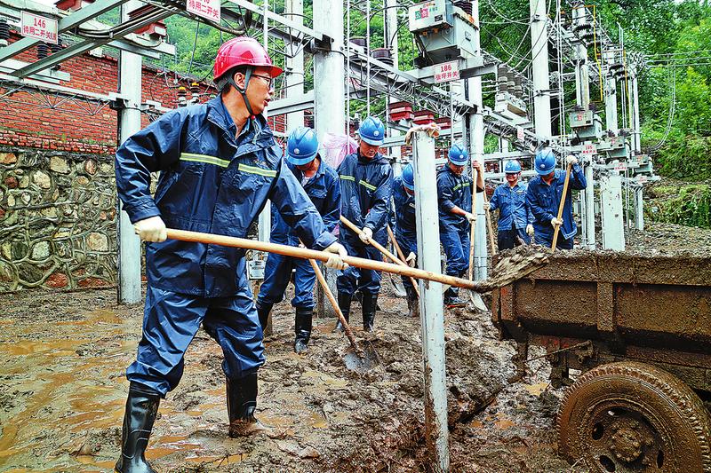 7月24日,國(guó)網(wǎng)商洛供電公司變電檢修中心共產(chǎn)黨員突擊隊(duì)在洛南災(zāi)區(qū)開(kāi)展搶修作業(yè)。洛南縣洛源鎮(zhèn)35千伏洛源變因“7·23”暴雨導(dǎo)致北側(cè)圍墻被雨水滑坡沖倒,大量淤泥漫入變電站院內(nèi),普遍深度達(dá)50厘米左右,該公司第一時(shí)間組織人員、物資趕赴現(xiàn)場(chǎng),展開(kāi)清淤工作,以保證設(shè)備具備正常運(yùn)行條件。當(dāng)晚,黑彰線(xiàn)成功送電。(雷蕾 攝)