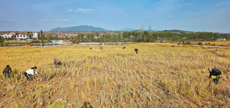 洛南縣保安鎮(zhèn)堅持農(nóng)文旅融合,今年該鎮(zhèn)在倉圣社區(qū)洛惠渠下實施的觀光農(nóng)業(yè)項目水稻示范種植面積達120余畝,繪就出產(chǎn)業(yè)興、生態(tài)美、村民富的鄉(xiāng)村振興新畫卷。圖為11月3日,保安鎮(zhèn)組織群眾利用晴好天氣收割水稻,確保顆粒歸倉。 (本報通訊員 楊開讓 攝)