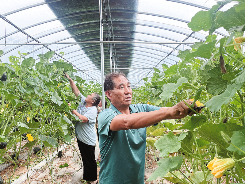 △分裝車間內(nèi),工人正在進行水果番茄分揀和包裝作業(yè)。?村民在高山有機蔬菜產(chǎn)業(yè)園內(nèi)給貝貝南瓜藤掐蔓。