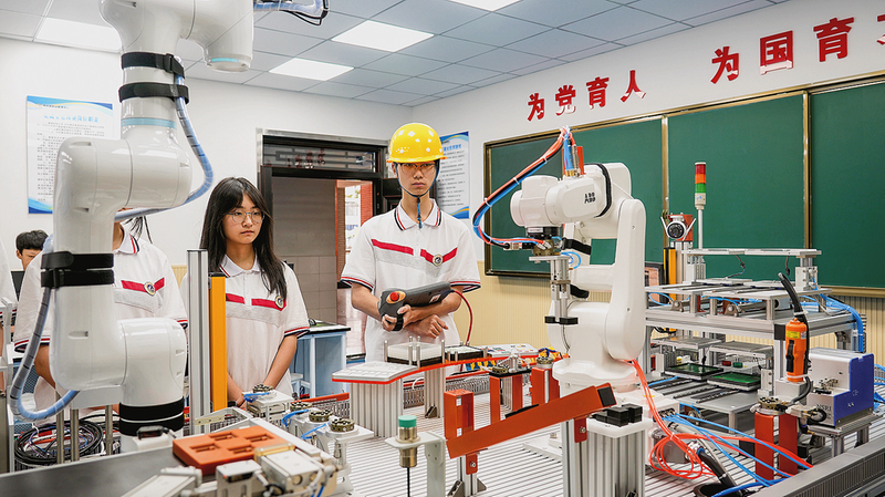 鎮(zhèn)安縣職教中心學(xué)生正在學(xué)習(xí)機(jī)械自動(dòng)化生產(chǎn)操作。